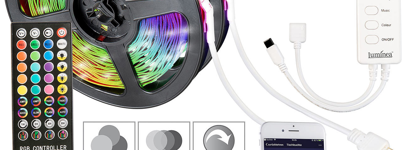 Bequeme und flexible Steuerung: Per kostenloser App steuert man den Lichtstreifen ganz gemütlich vom Sofa aus – auch von weltweit! Einstellbar sind die Helligkeit sowie die Lichtfarbe in allen Farben des Regenbogens – man kann aus 16 Mio. Farbtönen wählen! Liegt das Smartphone gerade nicht griffbereit, nutzt man schnell die Fernbedienung.