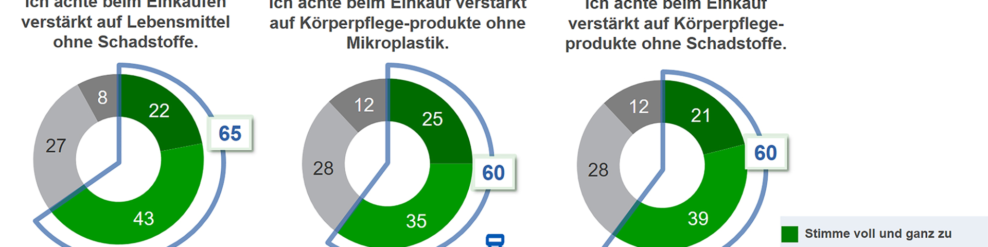 Zum nachhaltigen Einkaufen gehört z.B., dass 65% der Befragten auf Schadstofffreiheit bei Lebensmitteln achten, bei Körperpflegeprodukten sind es 60%. Dabei sind Frauen und ältere Befragte besonders sensibel bzgl. Schadstoffe und Mikroplastik bei Körperpflegeprodukten.