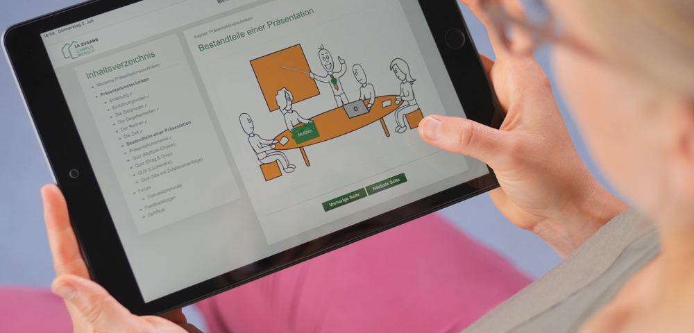 Die 1a Zugang entwickelt dauerhaft neue themenspezifische E-Learning- und Web-Seminar-Angebote. Zusammen mit den Kunden entwickelt sie app- und webbasierte Lösungen, die an individuelle Bedarfe der Kunden angepasst sind.
