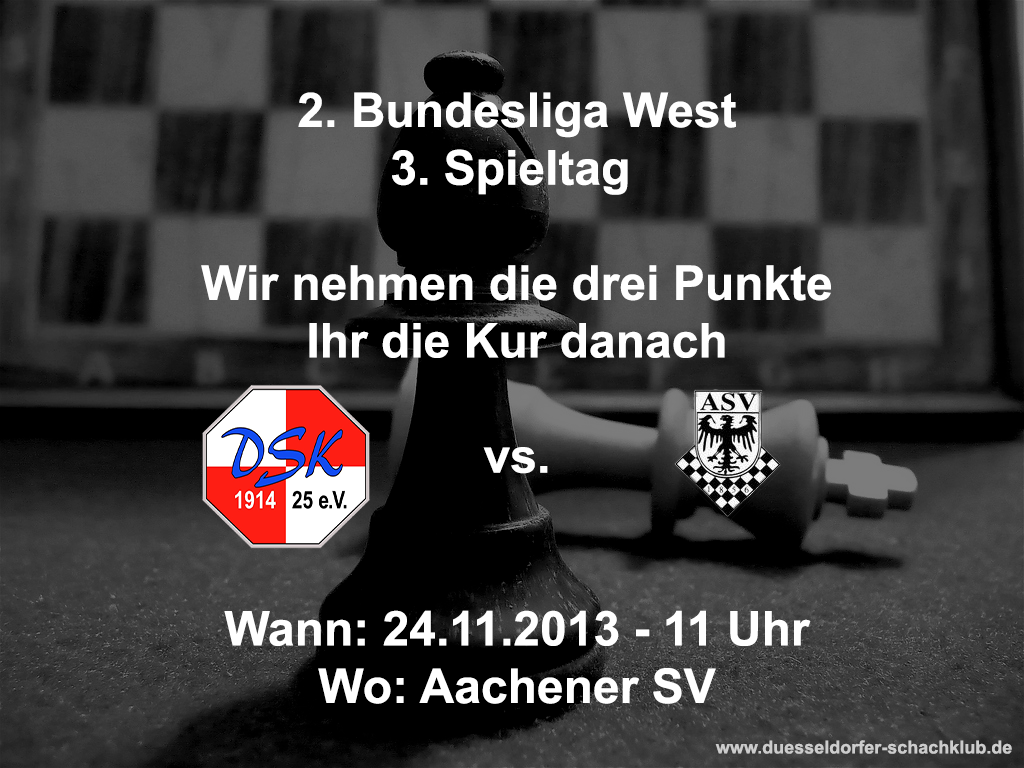 Als Gast wird DSK 1 am übernächsten Wochenende(24.11.2013) in Aachen antreten. Der Aachener SV ist uns noch aus der letzten Schach Saison in Erinnerung. Damals sind wir nicht richtig aus den Startlöchern gekommen im Match und haben verloren. Genau das wird nun nicht noch einmal passieren.