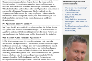 WeiterlesenGörs Communications über die Vor- und Nachteile von PR-Agenturen und Public Relations Beratern Public Relations (PR) ist ein wichtiger Bestandteil…