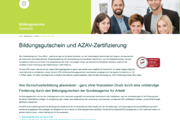 Weiterlesen– BTB bietet AZAV-zertifizierte Lehrgänge über bundesweit einlösbaren Bildungsgutschein der Arbeitsagenturen an – BTB erweitert mit Zertifizierung sein Angebot an…