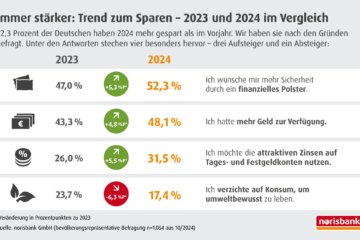 norisbank Umfrage zeigt: 2024 steigt die Sparquote – inmitten der Wirtschaftsflaute – Globale Sorgen und das Bedürfnis nach Sicherheit steigern…