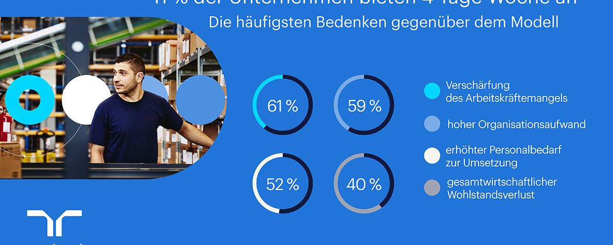 Die 4-Tage-Woche bietet aus Sicht einiger Unternehmen durchaus Potenzial für das Employer Branding. Mögliche positive Effekte der 4-Tage-Woche sehen die Befragten in der Mitarbeiterbindung (35 %) sowie der Mitarbeitermotivation (32 %). Doch die Bedenken überwiegen: 59 % der Betriebe berichten, dass für die Umsetzung mehr Personal nötig wäre. Ferner befürchten 52 % einen hohen Organisationsaufwand und 40 % einen gesamtwirtschaftlichen Wohlstandsverlust. Besonders hoch ist der Anteil derjenigen, die mit einer Verschärfung des Arbeitskräftemangels durch verkürzte Arbeitszeiten rechnen – fast zwei Drittel (61 %) der Umfrageteilnehmer teilen diese Ansicht.