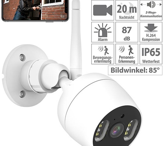 Besonders smart überwachen, auch bei Nacht: Die WLAN-IP-Überwachungskamera von 7links kontrolliert hochauflösend in Full HD. Bei Dämmerung und Dunkelheit leuchten 4 LEDs automatisch die Szene in bis zu 20 Meter aus. Auf Wunsch unterscheidet die Kamera zudem zwischen Personen und anderen beweglichen Objekten, z.B. Autos. So nimmt sie bei Bewegung automatisch nur das auf, worauf es auch ankommt!