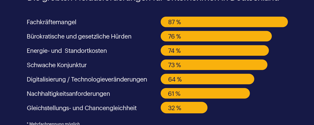 Eschborn, Februar 2024 – Für 87 % der Unternehmen in Deutschland stellt der Arbeits- und Fachkräftemangel eine aktuelle Herausforderung dar. Das zeigen die Ergebnisse der Randstad-ifo-Personalleiterbefragung Q4 2023. Aber auch bürokratische bzw. gesetzliche Hürden (76 %) und steigende Energie- und Standortkosten (74 %) sind für viele der befragten Unternehmen herausfordernde Faktoren.