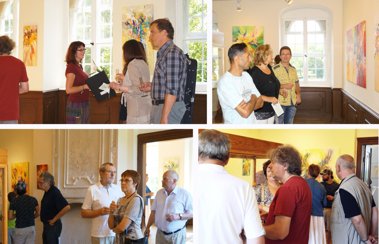 Das Werke der Ausstellung und das Schloss bereichern sich gegenseitig. Das Schloss bietet einen sehr würdigen Rahmen mit seiner hohen Ausstrahlungskraft, während die Bilder dem Schloss modernes Leben einhauchen. Der Betrachter kann in den Farbkompositionen der Gemälde spazieren gehen und sich in seine Gedanken vertiefen. Die Gemälde sind von unterschiedlicher Größe, zwischen 20 x 50 cm und 160 x 110 cm. Die drei Ausstellungsräume im ersten Stock neben dem feierlichen Barocksaal, in dem die Ausstellungseröffnung mit klassisch spielenden Musikern stattfand, beherbergen jeweils eine Auswahl harmonierender Farbwelten.