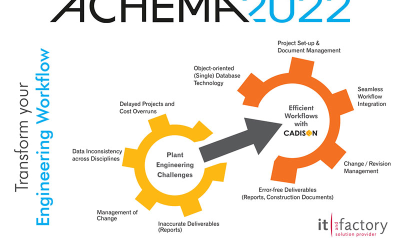 Auf der diesjährigen ACHEMA stellt die ITandFactory GmbH vom 22. bis 26. August 2022 seine intelligenten und digitalen Engineering-Lösungen in Frankfurt vor. Im Mittelpunkt steht die Anlagenplanungssoftware CADISON, die auf einer zentralen Datenbank basiert und branchenübergreifend einsetzbar ist.
