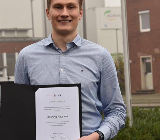 Die Ausbildung hat sich für den 22-Jährigen in mehrfacher Hinsicht gelohnt. Inzwischen wurde Henning Raesfeld als Mitarbeiter übernommen und arbeitet im Team der IT im Projektmanagement mit. Darüber hinaus wurde er für seine sehr guten Prüfungsleistungen von der IHK im November 2020 als Landesbester geehrt. „Wegen der Corona-Maßnahmen war die Veranstaltung zunächst in einem Fußballstadion geplant worden, musste am Ende aber doch abgesagt werden. Dafür gab es Post von der IHK mit Präsenten und der offiziellen Urkunde.“