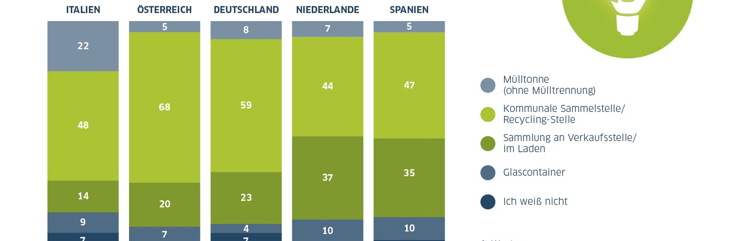 Bei Betrachtung der Studienergebnisse ist festzustellen, dass 62 bis 88 Prozent der Befragten den richtigen Entsorgungsort für Altlampen in den fünf Ländern kennen. 61 bis 75 Prozent nutzen kommunale Sammelstellen, um Altlampen zu recyceln. Der Prozentsatz der Verbraucher, die Altlampen zur Entsorgung in Geschäfte bringen, ist geringer und liegt bei 38 bis 59 Prozent – mit einer etwas stärkeren Ausprägung in Spanien, den Niederlanden und Deutschland.