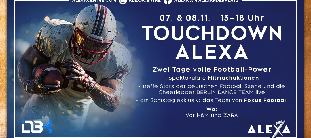 „Touchdown ALEXA“, unter diesem Motto feiert das beliebte Shopping- und Freizeitcenter am Alexanderplatz vom 7. bis 8. November ein großes American Football-Event – jeweils von 13 bis 18 Uhr. Stars aus der deutschen Footballszene wie das Hauptstadt-Footballteams „Berlin Adler“ geben Profi-Einblicke in die faszinierende Sportart. Cheerleader des BERLIN DANCE TEAM sorgen mit sportlich-akrobatischen Choreografien für echte Show-Momente und gute Stimmung. Am Samstag, 8. November kommt das Podcast-Team von „Fokus Football“ ins ALEXA. Die drei Football-Experten Jan Weinreich, unter anderem bekannt von Football-Übertragungen bei RTL, Patrick „Marek“ Piechaczek und Valentin Rödiger moderieren und übertragen einen Livestream des Events auf Twitch. Alle Zuschauer sind herzlich eingeladen dabei zu sein, wenn das Trio mit zahlreichen Gästen eine neue Folge für seinen Podcast direkt im ALEXA aufnimmt. Das Event wird in Zusammenarbeit mit DBK Media realisiert.