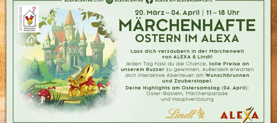 Am 4. April wird das ALEXA zur zauberhaften Bühne: Um 15 Uhr sind alle kleinen Besucher eingeladen – märchenhaft verkleidet – bei der großen Märchenparade durch das ALEXA zu ziehen. Als festlicher Abschluss wartet eine goldene Truhe voller Lindt-Schokolade – jedes teilnehmende Kind darf sich über eine süße Überraschung freuen. Im Anschluss folgt um 16:30 Uhr die große Verlosung der Hauptgewinne am Märchenstand.