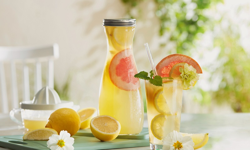 Selbstgemachte Zitronenlimonade, präsentiert in formschönen Glaskaraffen, macht das Thema „Zitrone“ komplett. Sehr praktisch ist die Karaffe mit Schraubdeckel. Da haben Insekten keine Chance und durch die große Öffnung können Früchte, Kräuter und Eiswürfel bequem eingefüllt werden. Stilvoll serviert werden kann die Limonade mit einem Trinkhalm aus Glas.