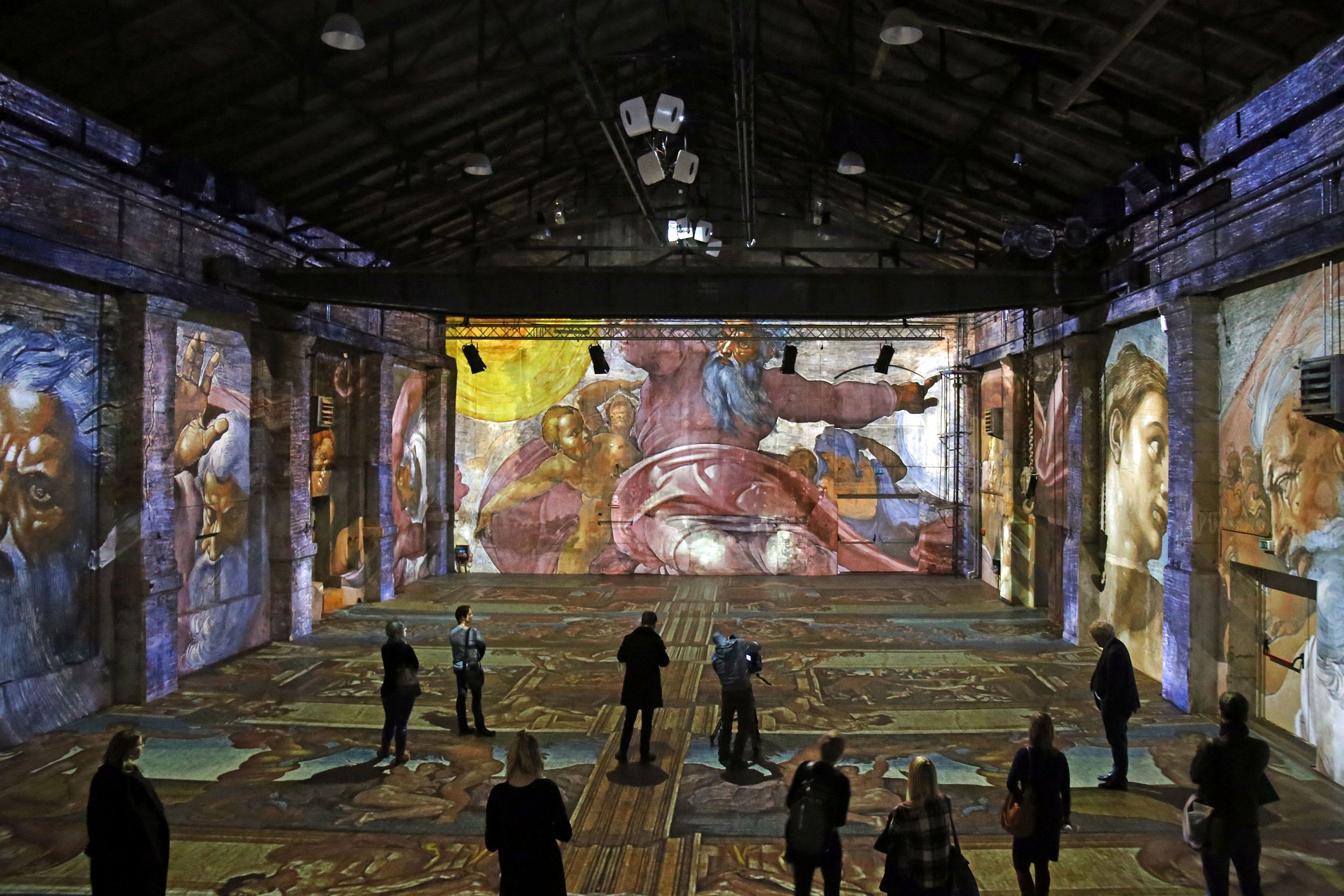 Auf einer Fläche von 7.000 Quadratmetern erzählt die erstmals in Deutschland zu sehende innovative Ausstellung von den wichtigsten Werken und Lebensstationen der drei Universalgenies der Hochrenaissance und bietet einen ganz neuen Blick auf die Alten Meister. Hier kann man zwischen den Fresken von Michelangelo aus der Sixtinischen Kapelle wandeln, am Abendmahltisch von da Vinci stehen oder Raffaels Madonnen in die Augen schauen.