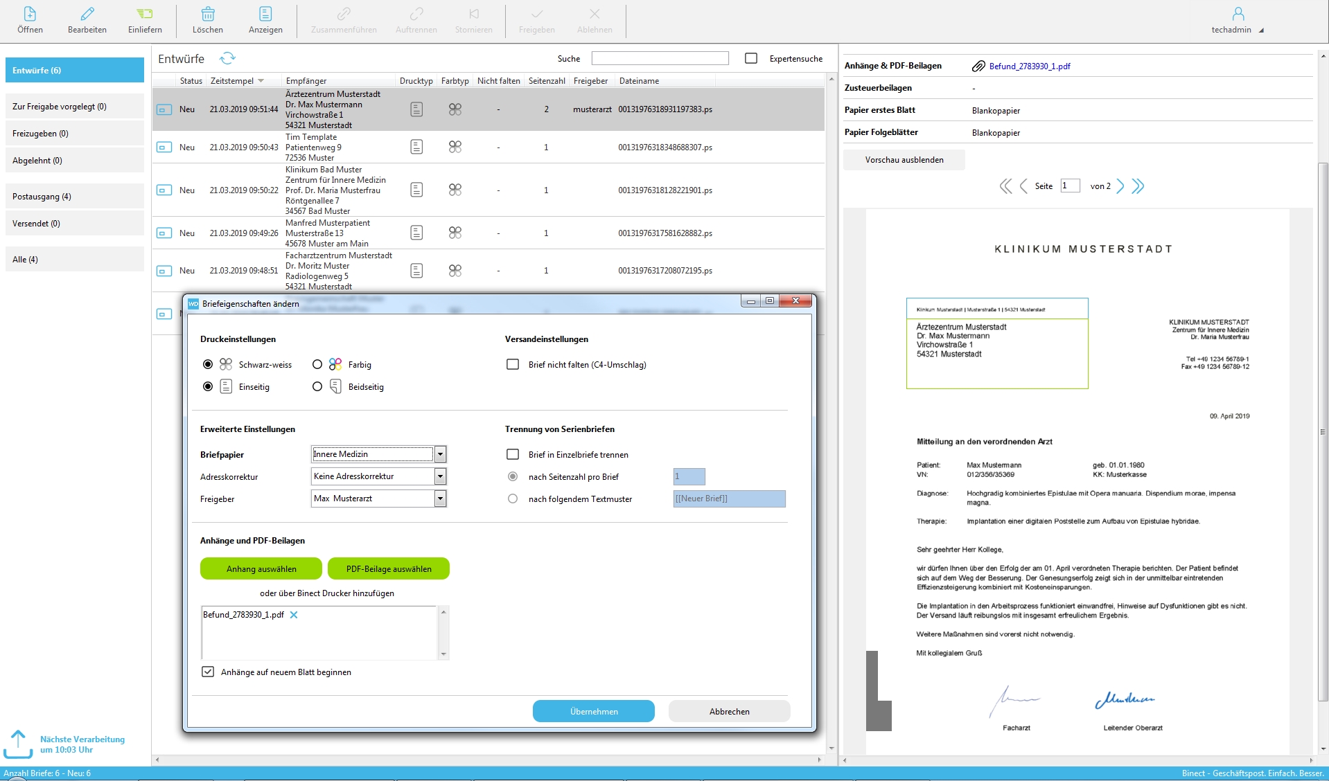 Dies gelingt, weil Binect die Funktion an den Freigabeprozess gekoppelt hat. Damit ist sichergestellt, dass generell nur freigegebene und vidierte Dokumente verschickt werden. Diese Praxis, die Binect bereits seit Jahren erfolgreich für Großversender im Bereich Krankenkassen und Kliniken einsetzt, wird künftig standardmäßig erhältlich sein.