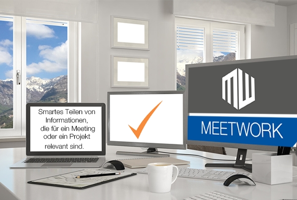 Mit der weiteren eigenentwickelten Cloud-Lösung MEETWORK werden Besprechungen und sämtliche Informationen zu einem Meeting auf einer Plattform integriert. Ganz unkompliziert erhalten alle autorisierten Teilnehmer Zugriff auf die Daten und Themen. Der Informationsaustausch der Meetingteilnehmer erfolgt in Echtzeit.
