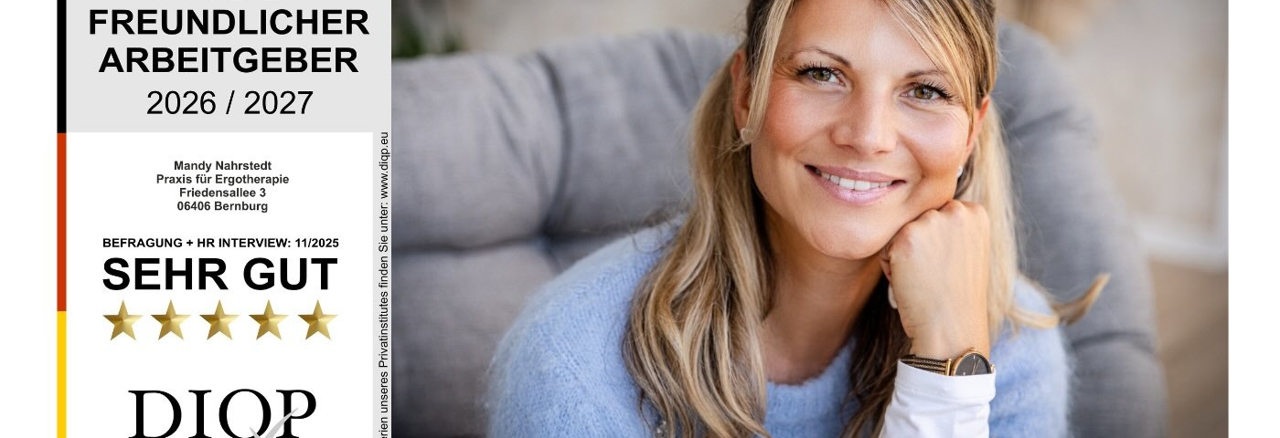 Die Praxis für Ergotherapie Mandy Nahrstedt aus Bernburg an der Saale wurde mit dem Arbeitgebersiegel „Familienfreundlicher Arbeitgeber“ und der Bewertung „sehr gut“ ausgezeichnet. Grundlage der Zertifizierung war eine unabhängige und repräsentative Mitarbeiterbefragung sowie ein strukturiertes HR-Interview. Die Auszeichnung würdigt das besondere Engagement der Praxis für eine familienorientierte und mitarbeiterfreundliche Arbeitsorganisation.