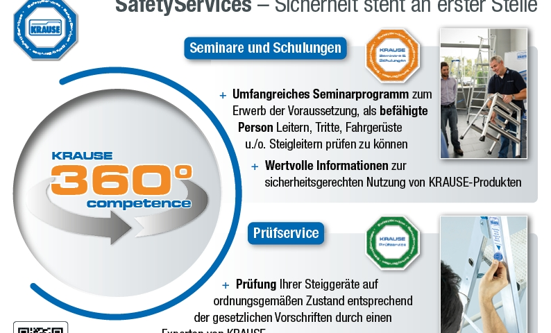 Ein weiterer wichtiger Baustein für sicheres Arbeiten in der Höhe ist der einwandfreie Zustand der verwendeten Arbeitsmittel. Dies ist nicht nur wichtig und freiwillig, sondern im gewerblichen Bereich sogar gesetzlich vorgeschrieben. Unternehmen müssen ihre Arbeitsmittel regelmäßig prüfen lassen und dies dokumentieren. Das gilt für alle Betriebsgrößen und Branchen. Eine Leiter in einem Büro muss also ebenso regelmäßig geprüft werden wie ein fest installierter Zugang in einem Industriebetrieb. Arbeitgeber, die dieser Pflicht nicht nachkommen, können bei Unfällen haftbar gemacht werden. KRAUSE bietet speziell für diesen Bereich die „SafetyServices“ an. Diese umfassen eine Reihe von Seminaren, Schulungen und Produktprüfungen, die speziell auf die Arbeitssicherheit in Unternehmen ausgerichtet sind. Jeder Betrieb wird auf Wunsch individuell betreut und erhält genau das Servicepaket, das zu ihm passt.