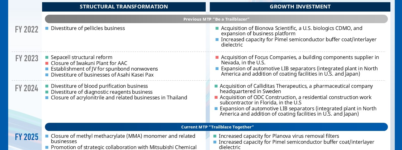 Im Rahmen seines dreijährigen mittelfristigen Managementplans „Trailblaze Together“ fokussiert sich Asahi Kasei auf die Verbesserung der Kapitaleffizienz. Dazu führt das Unternehmen derzeit umfassende Strukturreformen im Materialbereich durch und konzentriert die Ressourcen auf die wichtigsten Wachstumsbereiche – Pharmazeutika, Intensivmedizin, Elektronikkomponenten und Materialien für die Halbleiterindustrie. Jüngste Maßnahmen wie der Ausstieg aus dem Geschäft mit Methylmethacrylat (MMA)-Monomeren sowie die Erweiterung der Kapazitäten für photosensitive Polyimide zeigen, dass Asahi Kasei diese Strategie konsequent umsetzt und die Grundlage für nachhaltiges, profitables Wachstum stärkt.
