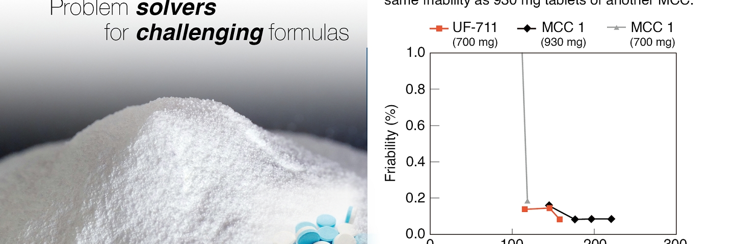 Beschwerdefreies Schlucken von Tabletten oder Kapseln ist für kleine Kinder, ältere Menschen oder Patienten mit Schluckbeschwerden eine Herausforderung. Diese wachsende Patientengruppe erwartet daher praktische und einfache Darreichungsformen. Die hohe Kompaktheit von Ceolus™ UF-711 ermöglicht es, mit einer geringeren Menge MCC eine ausreichende Härte zu erzielen und so die Tablettengröße im Vergleich zu Tabletten mit herkömmlichen MCC-Typen um bis zu 30 % zu reduzieren (Abbildung 1).