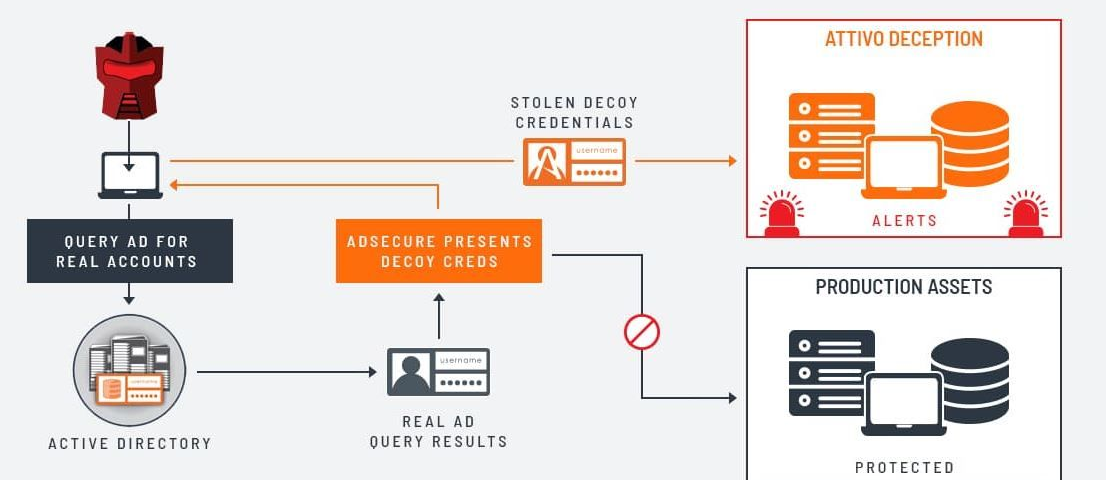 ADSecure wird aktiv, sobald ein Angreifer über einen kompromittierten Endpoint eine nicht legitime Query in Microsoft Active Directory (AD) startet, etwa über Informationen nach Domain-Admins oder Domain-Controllern. Dabei wird die Anfrage zunächst ganz regulär an den AD-Server geleitet und dort ordnungsgemäß verarbeitet. Doch sobald die Antwort vom AD-Server an den Endpoint zurückkommt wird diese von ADSecure modifiziert; der Angreifer endet in der virtuellen Attivo Networks Deception Fabric.