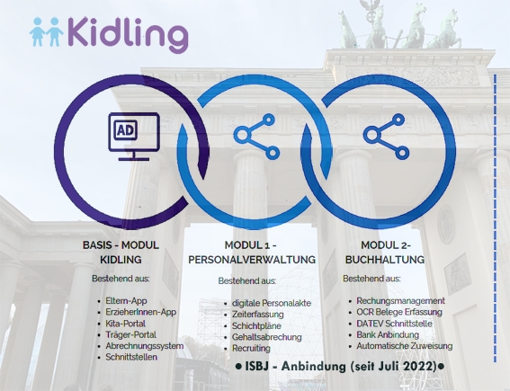 Mit der Schnittstelle zur Berliner Verwaltung ergänzt Kidling speziell für die Berliner Kitas sein bereits bestehendes Angebot für Kitas bundesweit. Zur Kidling Kita-Komplettlösung gehören neben Eltern- und ErzieherInnen-Apps, Dokumentations- und Planungstools für Kita-Teams und Verwaltungssysteme für die Kita-Leitung, ebenso wie ein Verwaltungssystem für Kita-Leitung und -Träger.