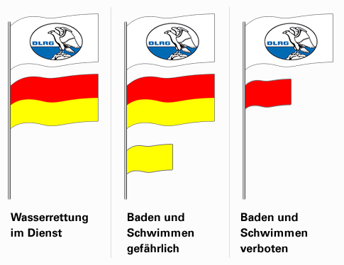Viele Urlauber kennen aber die Bedeutung der Flaggen nicht oder ignorieren die Hinweise des Schutzpersonals. Eine rot-gelbe Flagge an der Station bedeutet, dass die Station besetzt ist. Normalerweise sind die Rettungsschwimmer von 9 Uhr bis 18 Uhr im Dienst und entfernen danach die Beflaggung. Wird zusätzlich noch eine gelbe Flagge gehisst, so ist Vorsicht angeraten und nur geübte Schwimmer ohne körperliche Beeinträchtigungen sollten ins Wasser. Bei einer roten Flagge ist Badeverbot.