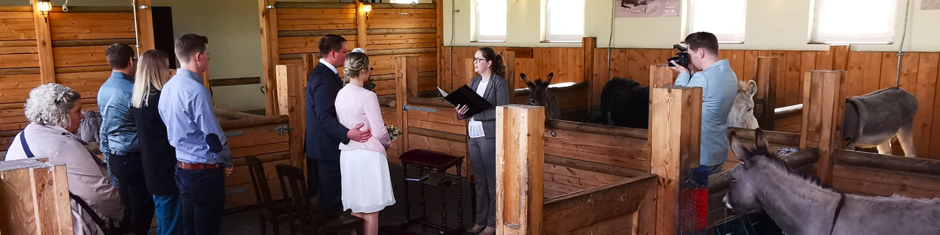 Es war der Wunsch der schönen Braut, mit den Eseln als weitere Trauzeugen den Bund fürs Leben mit ihrem Liebsten einzugehen. Und so traute die Schwafördener Standesbeamtin Kim Meyer die Brautleute Laura Fortmann und Nils Schünemann aus Anstedt (Gemeinde Scholen) im Beisein vieler Familienmitglieder und der geretteten Esel von Gut Aiderbichl im romantischen Eseldorf.