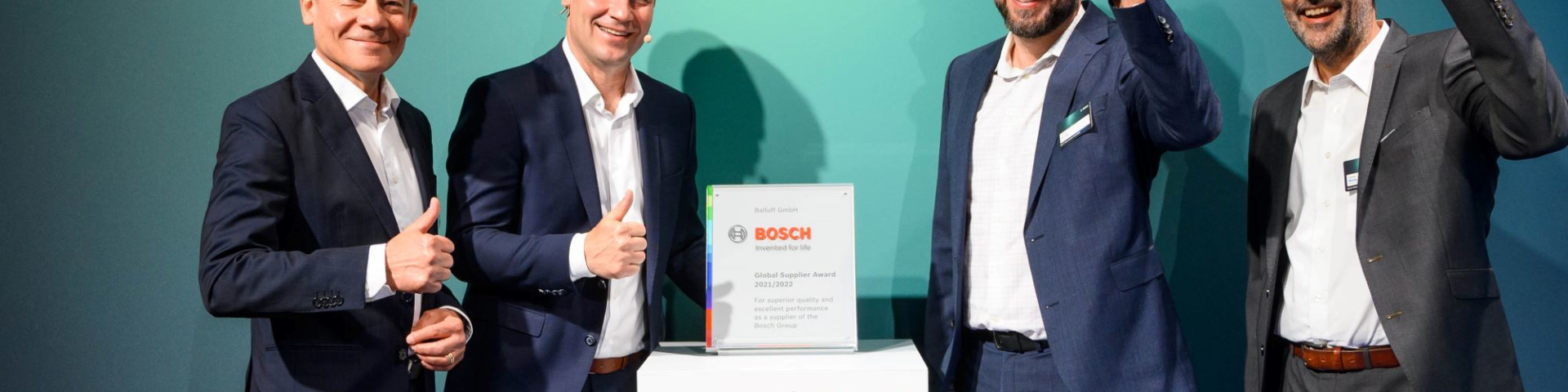 Die Balluff GmbH zählt zu den weltweit besten Lieferanten von Bosch und erhielt dazu vom Technologie- und Dienstleistungsunternehmen die Auszeichnung „Bosch Global Supplier Award“ in der Kategorie: „Indirekter Einkauf und Dienstleistungen“. Der Sensor- und Automatisierungsspezialist wurde gemeinsam mit nur 45 Lieferanten aus 11 Ländern unter rund 35 000 Lieferanten ausgewählt und prämiert. Die Bosch-Gruppe würdigt damit zum 18. Mal überdurchschnittliche Leistungen seiner Lieferanten bei der Herstellung oder Lieferung von Rohmaterial, Produkten oder Dienstleistungen – insbesondere hinsichtlich Qualität, Kosten, Nachhaltigkeit und Innovationen.