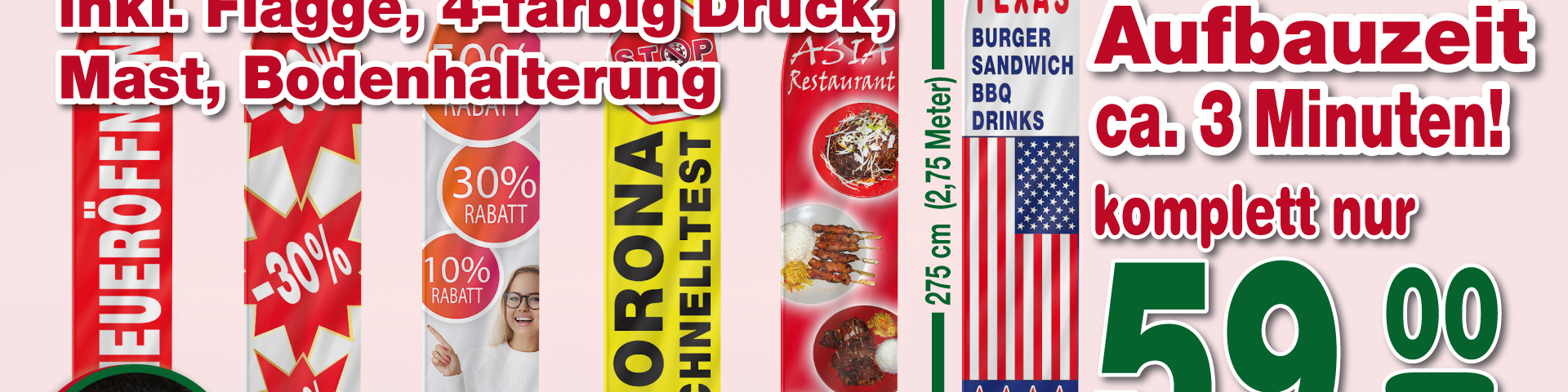 Wir gestalten Ihre Beachflag nach Ihren Wünschen zum Festpreis, inkl. Flagge, 4-farbig Druck, Mast, Bodenhalterung und inklusive Lieferung.