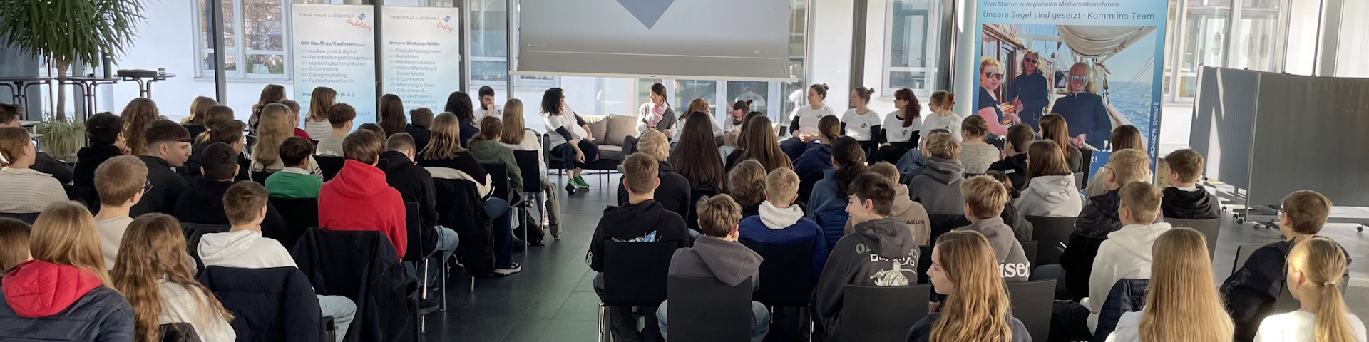 Nachwuchsförderung in der Region ist für die FORUM MEDIA GROUP von großer Bedeutung. Das Unternehmen bereitet Jugendliche nicht nur an einem einzelnen Tag auf die Berufswahl vor, sondern kooperiert kontinuierlich mit vielen umliegenden Schulen – etwa mit Bewerbungsworkshops, Praxistagen im Unternehmen oder auf Berufsinformationsmessen. Dabei geht es immer darum, Einblicke in die Arbeitswelt zu geben, reale Auswahlverfahren darzustellen und den Übergang von der Schule in die Arbeitswelt so transparent wie möglich zu machen.