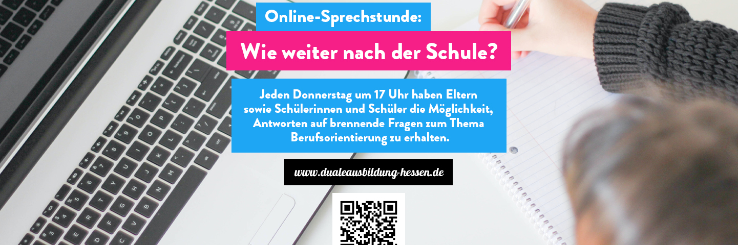 Im Rahmen der Landesinitiative „Duale Ausbildung in Hessen“ wird ab dem 28.05.2020, immer donnerstags um 17:00 Uhr eine wöchentliche Online-Sprechstunde rund um das Thema „berufliche Orientierung“ angeboten, um Eltern sowie Schülerinnen und Schülern trotz ausfallender Berufsorientierung in den Schulen Hilfestellung für wichtige Entscheidungen zu geben.