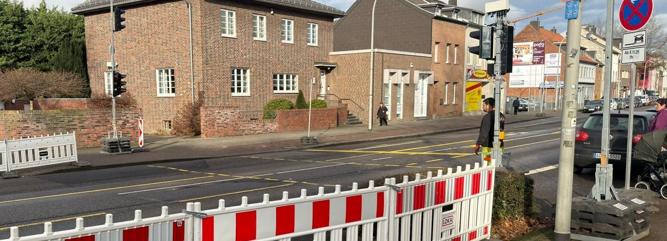 Ein zentrales Element für die Absperrung der Baustelle ist eine separate Baustelleneinfahrt über die Hauptverkehrsachse Aachener Straße. Die Ausfahrt aus dem Baustellengelände erfolgt signalisiert und ausschließlich in südlicher Richtung. Sowohl die Ein- und Ausfahrt der Baustelle als auch die Fußgängerquerung werden mittels Sensorik überwacht. Der stark frequentierte Nord-Süd-Verkehr wird somit nur bedarfs- und anforderungsabhängig angehalten. Ergänzend sorgen zusätzliche eingerichtete Fahrbahnmarkierungen für eine klare und verständliche Verkehrsführung. Die Umsetzung dieses Konzepts erfordert u.a. den Rückbau einer Verkehrsinsel. Erweitert wird die Lösung durch eine intelligente mobile Ampelanlage, die den Fuß- und Radverkehr sicher einbindet. So wird die Baustellenabsicherung effektiv und gleichzeitig wenig belastend für den fließenden Verkehr umgesetzt.