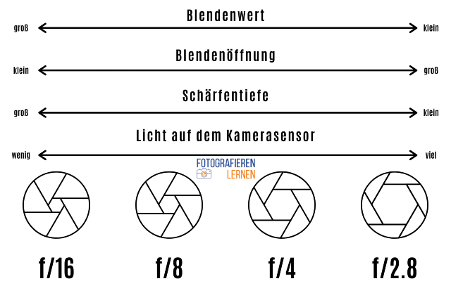 Zurück zur Blende. Sie hilft dir dabei, die Schärfentiefe einzustellen. Dabei gilt: Je weiter du deine Blende öffnest, desto unschärfer wird das Bild. Je weiter du deine Blende schließt, desto schärfer wird es. Schau dir deine Kamera einmal an. Auf der Blende siehst du verschiede Werte, zum Beispiel f2.8 für eine weit geöffnete Blende oder f18 für eine weit geschlossene Blende.