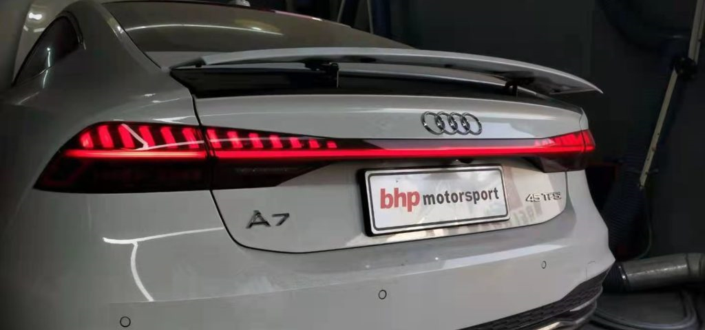 Weilheim an der Teck, 21.03.2021: Die bhp motorsport-Basis in Guangzhou, China, in der Nähe von Hongkong, hat das Chiptuning für den Audi A7 45 TFSI erfolgreich umgesetzt. Mit 245 PS beeindruckt der Audi-Vierzylinder von Haus aus mit einer soliden Serien-Performance, doch nach einer professionellen Leistungssteigerung mittels Kennfeldoptimierung (Map Optimization) standen hinterher 300 PS auf dem Leistungsprüfstand. Das Drehmoment wurde von 370 auf 440 Nm gesteigert. Der A7 TFSI wurde unter den Händen der Meister der bhp-China-Basis noch schneller, agiler und spritziger. Das Foto des Audi – von hinten – wurde bewusst gewählt, denn das wird der allerhäufigste Anblick sein, wenn man nicht selbst drin sitzt. Um diese Performance zu erreichen, ist jedoch ein sensibles und technisch herausforderndes Vorgehen notwendig.