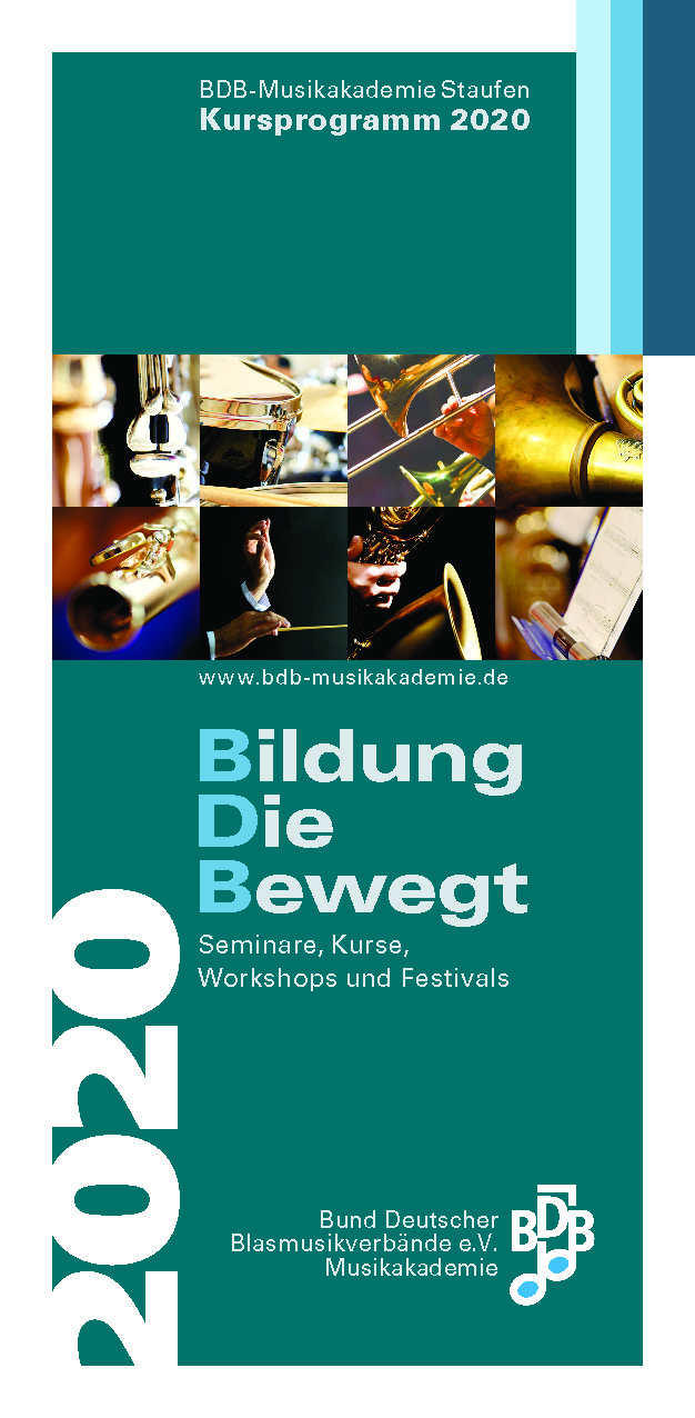 Die BDB-Musikakademie Staufen bewegt Bildung – das stellt das Kursprogramm 2020 eindrücklich unter Beweis. Auf rund 120 Seiten breitet es ein facettenreiches Bildungsprogramm aus, das einer breiten Zielgruppe Fortbildung, Impulse und Inspiration verspricht und mit innovativen Konzep-ten, stilistischer Vielfalt und kultureller Breite Akzente setzt.