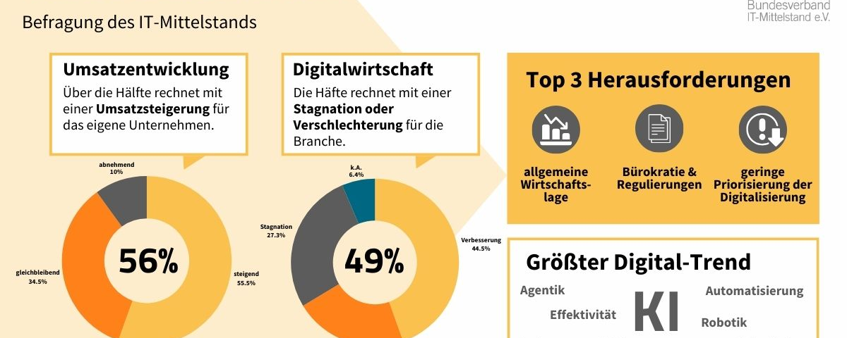 Der IT-Mittelstand blickt mit einer verhaltenen Prognose auf das neue Jahr, erweist sich jedoch weiterhin als resilient gegenüber der angespannten gesamtwirtschaftlichen Lage. Das zeigt eine aktuelle Umfrage des Bundesverband IT-Mittelstand e. V. (BITMi). Zwar rechnet eine knappe Mehrheit der befragten Unternehmen mit einem Umsatzwachstum im eigenen Haus (56 Prozent), zugleich erwarten jedoch rund die Hälfte eine Stagnation (27 Prozent) oder sogar eine Verschlechterung (22 Prozent) der Lage der deutschen Digitalbranche insgesamt. Hauptursache hierfür ist aus Sicht der überwiegenden Mehrheit die allgemeine Wirtschaftslage (77 Prozent). Darüber hinaus sehen mehr als die Hälfte der Befragten gesetzliche Regulierungen und Bürokratie als zentrale Herausforderung für die Branche (55 Prozent). Knapp die Hälfte nennt zudem die unzureichende Priorisierung der Digitalisierung (48 Prozent) sowie der digitalen Souveränität (45 Prozent) als wesentliche Hemmnisse. Ein Viertel der Unternehmen verweist schließlich auf den Fachkräftemangel und eine unzureichende digitale Infrastruktur (jeweils 25 Prozent).