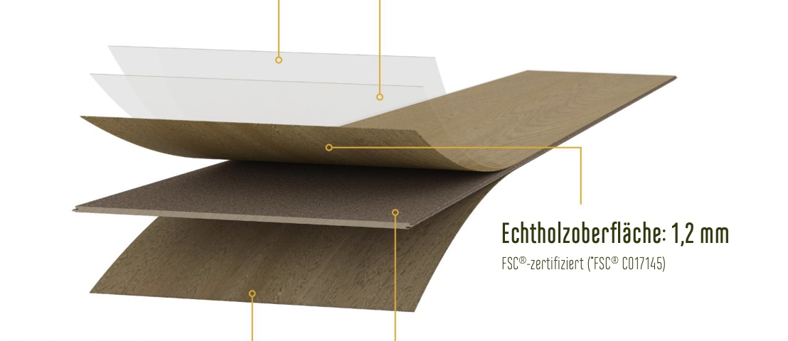 Die 1,2 mm starke und FSC-zertifizierte Echtholzoberfläche sorgt für einen ökologischen Mehrwert und eine unübertroffene authentische Optik. Als Träger wird eine FSC-zertifizierte 6,3 mm PE-Composite Platte verwendet. Als dritte FSC-zertifizierte Komponente dient der 0,5 mm starke Gegenzug für Formstabilität. Eine Schutzlasur bewahrt den Bodenbelag vor Feuchtigkeit und mechanischen Beschädigen (laufen mit Schuhen, spitze Absätze, herunterfallende Gegenstände, Schmutz usw.). Das Finish auf der Oberfläche lässt SUSIFY in jedem Licht perfekt aussehen.