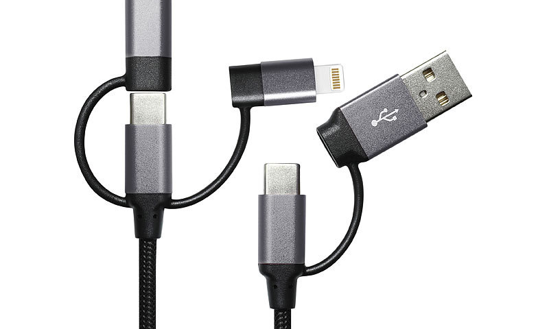 – 4 Stecker für Geräte mit USB A/C, Micro-USB, 8-Pin Lightning-kompatibel