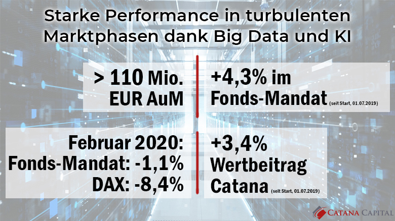 „Der durch das Coronavirus geprägte Februar 2020 stellte eine ideale Situation für unsere Big Data basierte KI-Overlay Strategie dar. Bereits in der ersten Monatshälfte, als der Markt noch von einem raschen Abflauen der Krise wie beim SARS Virus in 2003 ausging und neue Höchststände markierte, griff das Modell die Gefahr gut ab und positionierte die Overlay Strategie entsprechend.“, so Bastian Lechner, Gründer und CEO von Catana Capital.