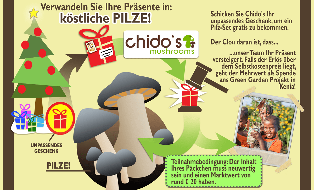 So funktioniert die Aktion: Wer in der Weihnachtszeit ein Geschenk bekommen hat, dass dem Beschenkten schlichtweg keine Freude macht, kann dieses Präsent an Chido’s Mushrooms schicken und bekommt dafür ‚den kleinen Pilzgarten‘ zum Züchten von Pilzen aus dem Sortiment des Unternehmens. Die Einsende-Adresse ist: