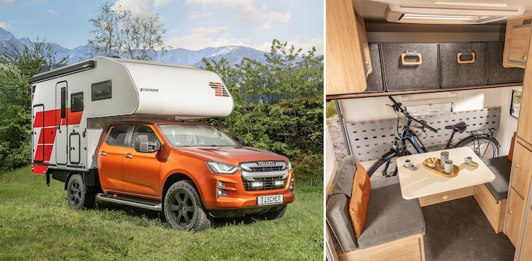 Dieses neue, von TISCHER auf Basis der langen Erfahrung für Individualaufbauten entwickelte Kabinenmodell gibt es am Messestand exemplarisch auf einem ISUZU D-MAX Doppelkabiner zu sehen. Ein typisches Merkmal von Flachpritschen-Pick-ups ist ihre durchgehend ebene, großzügige Ladefläche, die nicht durch hochstehende Radhäuser beschränkt wird. Damit haben die TISCHER Konstrukteure mehr Spielraum und Optionen beim Planen des Grundrisses und der Inneneinrichtung. Aufteilung und Möblierung können flexibler vorgenommen werden, wobei das Auf- und Absetzen genauso schnell und mühelos funktioniert wie bei allen anderen TISCHER Modellen. Passend für sportliche und individuelle Outdoor-Fans lassen sich in die neue Flatbed-Kabine mehr Wohnideen nach persönlichen Wünschen hineinpacken. Dabei kann TISCHER durch Manufakturfertigung selbst ungewöhnliche Pläne realisieren: z. B. mehr Schlafplätze im Kabineninneren, ein platzsparendes Stockbett für Kinder, eine U-Sitzgruppe zum Essen und geräumigere Küchenmöbel bis hinunter zum Boden. Auf Wunsch ist deutlich mehr Stauraum ebenso möglich wie größere Fenster und eine multifunktionale Sitzgruppe im Heck der Kabine. Sie kann durch einfaches, schnelles Hochklappen zur geschützten „Innengarage“ für Fahrrad, E-Bike, Kite, Kajak, Golf-Bag, Kinderwagen oder Buggy verwandelt werden.