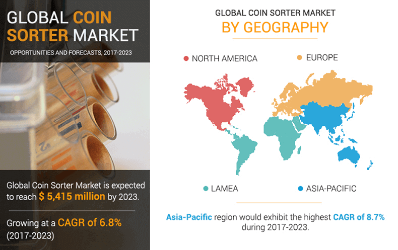 The global coin sorter market was valued at $3,486 million in 2016, and is projected to reach $5,415 million by 2023, growing at a CAGR of 6.8% from 2017 to 2023.