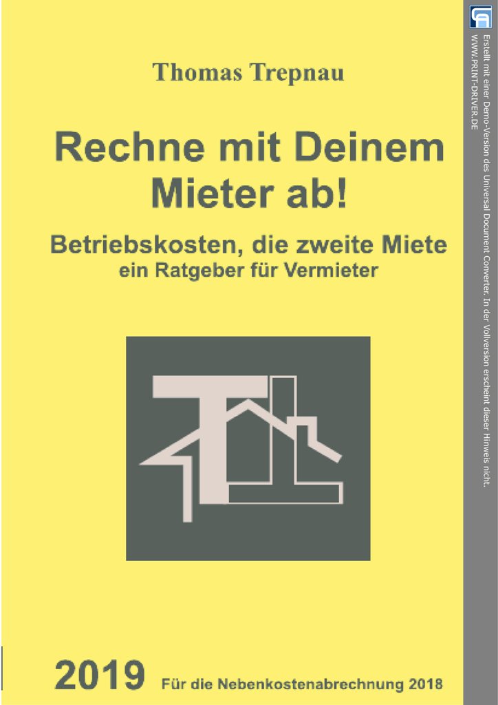Es gibt ihn. Der Autor Thomas Trepnau liefert mit seinem Buch “ Rechne mit Deinem Mieter ab – Betriebskosten, die zweite Miete “ exakt das, was jeder Vermieter dringend braucht: wichtige Informationen und Anleitungen zur Nebenkostenabrechnung. Hier wird dem Vermieter unter die Arme gegriffen.