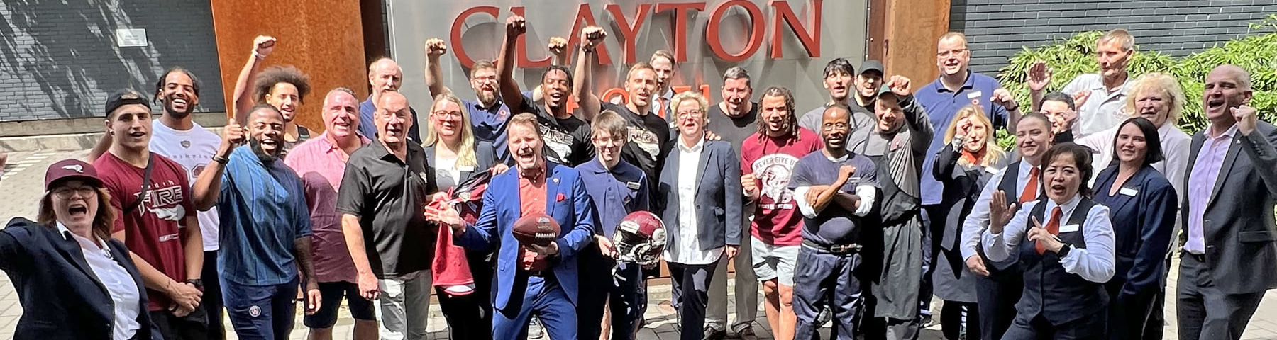 So hört sich Begeisterung an. Mit lauten RHEIN-FIRE-Rufen feierte das Team um Direktor Benjamin Tenius vom Clayton Hotel Düsseldorf die neue Kooperation mit dem American Football-Club RHEIN FIRE aus Düsseldorf. Dazu begrüßten sie einige der Top-Spieler, Headcoach Jim Tomsula und Geschäftsführer Tom Aust. Künftig möchte das renommierte Hotel in „Little Tokyo“ an der Immermannstraße auf vielfältige Weise den erfolgreichen Club der neuen European League of Football (ELF) unterstützen.