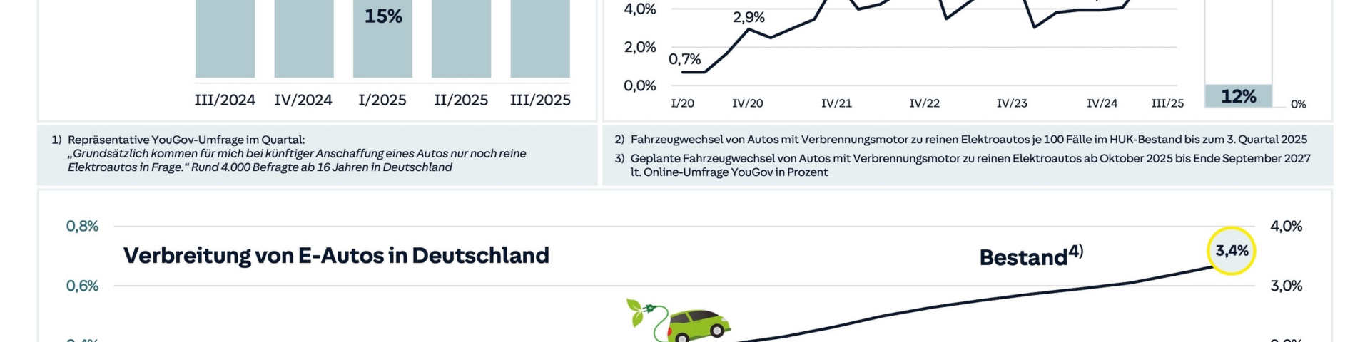 Das sind zentrale Ergebnisse des HUK-E-Barometers, die sich aus dem Versicherungs-bestand des marktführenden Unternehmens ergeben sowie aus parallel laufenden bundesweit repräsentativen Befragungen. Dr. Jörg Rheinländer, im Vorstand der HUK-COBURG zuständig für die Kfz-Versicherung: „Ein neuer Schub bei der Verbreitung von Elektroautos in Deutschland scheint jetzt da zu sein. Und die Pläne der Bundesregierung für eine neu konzipierte Förderung ab 2026 gehen aus unserer Sicht in die richtige Richtung.“