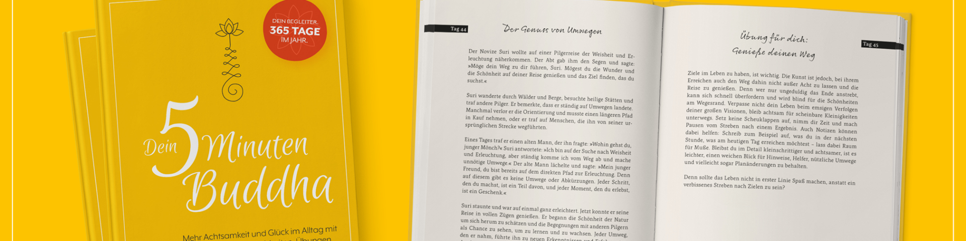 Die Idee hinter „Dein 5-Minuten-Buddha“ ist einfach, aber kraftvoll: Jedem Tag des Jahres ist eine Seite gewidmet. Die inspirierenden Texte sind jeweils in nur fünf Minuten gelesen, ihre Botschaften jedoch wirken lange nach. Sie laden dich ein, innezuhalten, darüber nachzudenken und ihre kraftvolle Essenz in individuellem Tempo in deine ganz persönliche Reise zur inneren Erfüllung zu integrieren. Sie ermutigen dich, dich von den tiefgründigen Weisheiten Buddhas, den liebevollen, neu verfassten Kurzgeschichten und den leicht umsetzbaren Übungen berühren und bewegen zu lassen – und neue Wege auszuprobieren.
