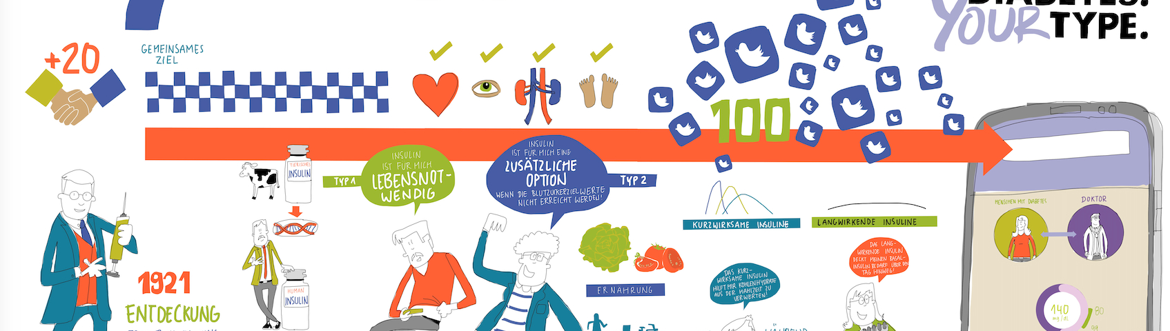 Am 28. Oktober um 16.30 Uhr geht die Aktion weiter. Bis dahin bleibt der Blick zurück, der Blick auf eine Zeichnung, die die halbstündige Expertenrunde in visueller Form festhält: Komplexe Inhalte sind darauf einfache Symbole und Schlagworte. Auch wenn die Aktion jedes Jahr neue Wege geht, so bleibt eines doch immer gleich: Der Mensch mit Diabetes steht im Mittelpunkt und jeder Mensch mit Diabetes ist einzigartig.