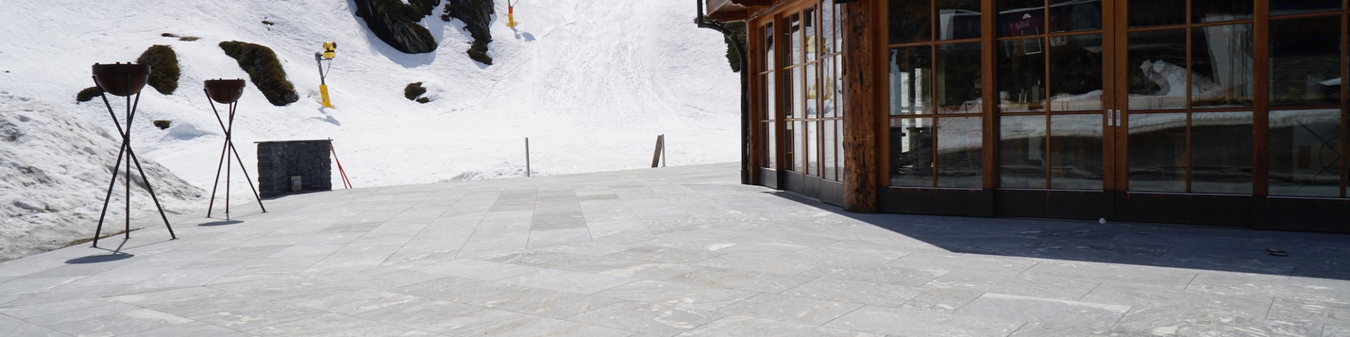 Dass dieses Prinzip auch unter extremen Bedingungen funktioniert, zeigt ein Blick nach Kaprun in Österreich. Die Terrassen der beliebten Almhütte Häuslalm am Kitzsteinhorn liegen in hochalpiner Lage und sind extremen Witterungseinflüssen ausgesetzt. Hier treffen lange Frostperioden auf intensive Sonneneinstrahlung und hohe Feuchtebelastung durch große Mengen Regenwasser, das über die Fugen in die Konstruktion gelangt – eine echte Bewährungsprobe für jeden Terrassenaufbau. Dennoch präsentieren sich die Beläge dort dauerhaft stabil und optisch hochwertig.