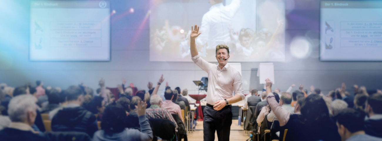 Auf Tagungen, Kongressen oder Kickoff-Meetings, für Mitarbeiter, Kunden oder Geschäftspartner – mit André May erhält jedes Event ein maximal 90-minütiges Highlight. Dabei bietet der Keynote-Speaker seine zündende Wissensvermittlung Kunden aus ganz Europa, auf Deutsch wie auch Englisch, vor Ort oder online. Mit einem Videotrailer gewährt er ihnen einen ersten Einblick in seine maßgeschneiderten Programme – die Kontaktaufnahme erfolgt per Webseite oder Telefon. Denn die einzigartigen Bühnenauftritte von André May sollte und wird sich niemand nicht entgehen lassen wollen.